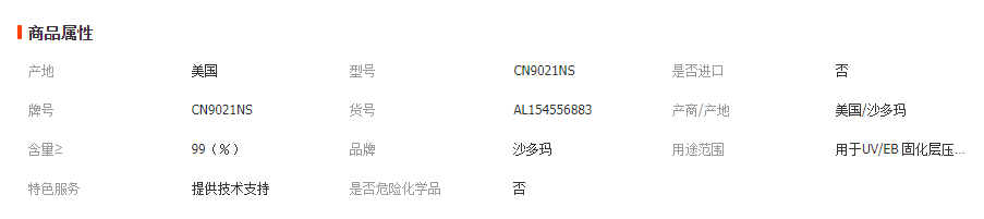 CN9021 NS丙烯酸酯產品描述CN9021 NS 用于UV/EB 固化層壓膠及壓敏膠配方。可提供良好的附著力,柔韌性及耐水性,特別對于玻璃材料。產品特征對玻璃附著力高伸長率耐濕產品性質良好的附著力良好的耐水性高伸長率柔韌性好建議應用層壓材料壓敏膠CN9021 NS 典型物理和化學性質外觀清澈液體顏色,APHA100粘度,厘泊 @60℃